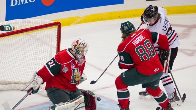 Halifax Mooseheads goaltender Zachary Fucale turns away a shot with the help of defenseman Austyn Hardie as Portland Winterhawks center Brendan Leipsic presses sduring the first period of a junior hockey Memorial Cup game Saturday, May 18, 2013, in Saskatoon, Saskatchewan. (AP Photo/The Canadian Press, Liam Richards)